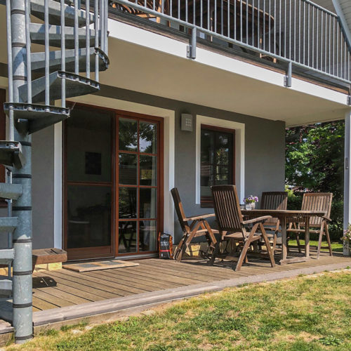 Unsere etwa 75 qm große Ferienwohnung im Erdgeschoß begeistert durch ihre sonnige Süd-West-Ausrichtung im Ostseebad Wustrow. Bereits früh morgens können Sie auf Ihrer großen Holzterrasse die Sonne beim Frühstück genießen, die Sie aufgrund der perfekten Süd-West-Lage der Terrasse bis in die Abendstunden begleitet. Unsere stilvoll und komfortabel ausgestattete Ferienwohnung lässt keine Wünsche offen.